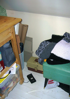 In the other half of the room we have my ironing board (everything to the right of it is just storage stuff--luggage, winter clothes, etc). There are always wires scattered about because of unfortunately placed electrical sockets (i.e. none anywhere near the window). The little rug used to be our bathmat, which I made by knitting together scraps of T-shirts. Now it lives up here, not really serving a purpose, but I like it too much to get rid of it.